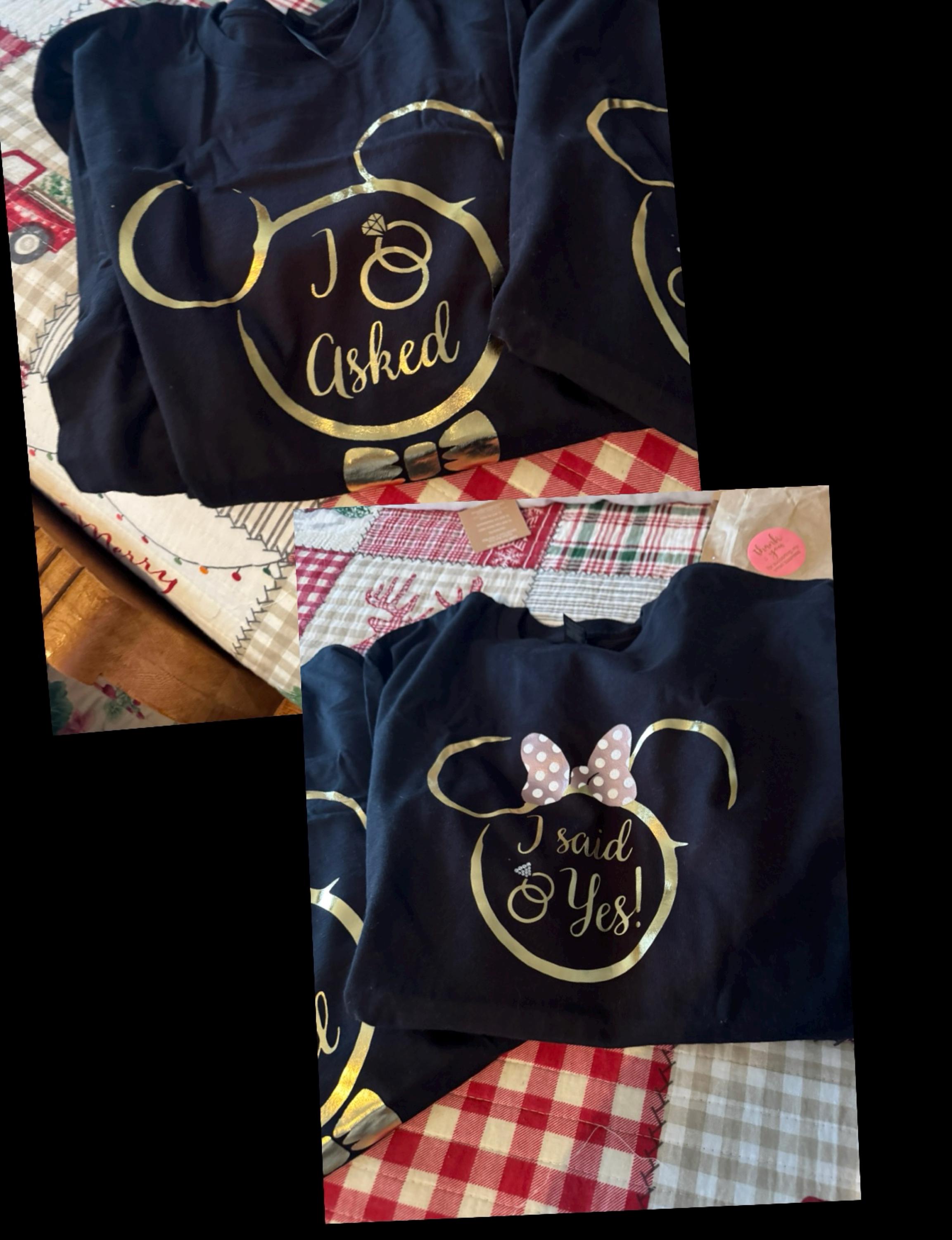 Celebrate your magical Disney engagement with these gorgeous matching couple theme park shirts perfect for your special celebration at Magic Kingdom. These Disney bride and groom announcement shirts make the perfect proposal outfit for capturing memorable photos in front of the castle while showcasing your engagement.