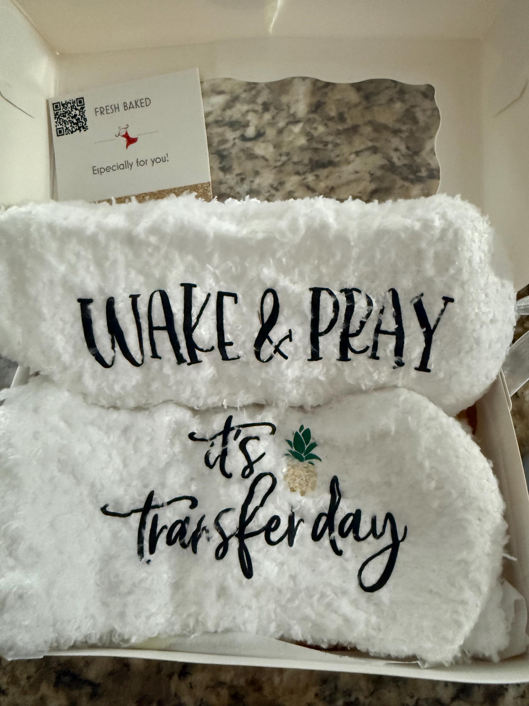 These wake and pray it’s transfer day fuzzy socks are a cozy and thoughtful way to support someone during their IVF journey. They make a personalized custom IVF socks customized embryo transfer gift idea perfect for transfer day comfort.