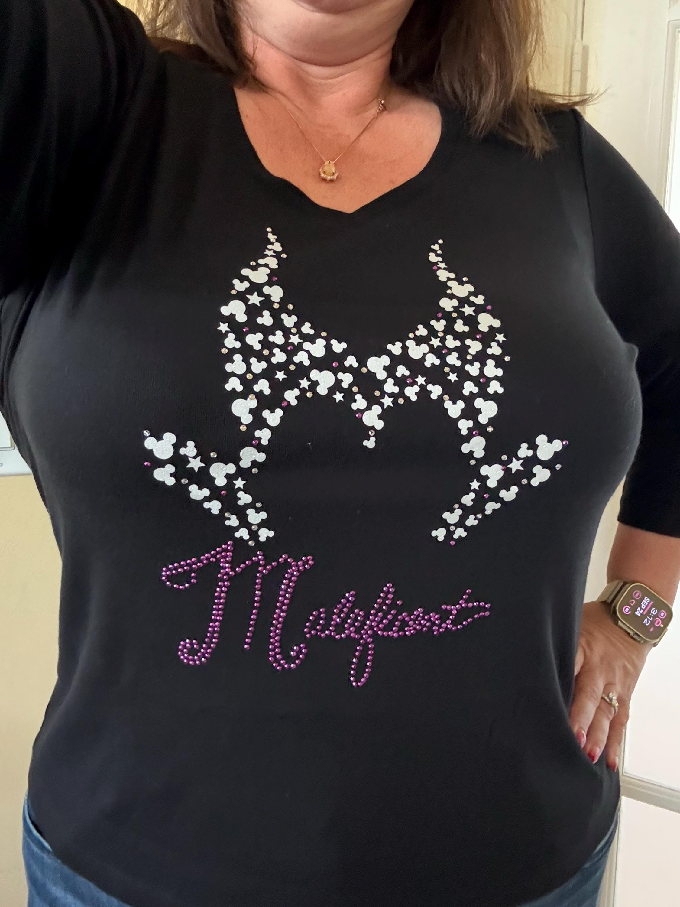 This women’s Glitter Rhinestone Maleficent shirt is a personalized, custom, customized Disney villain tee perfect as a birthday or Halloween party gift idea. Show off your favorite villain in style with a unique design that makes a great women’s Maleficent shirt gift idea for any Mouse fan.