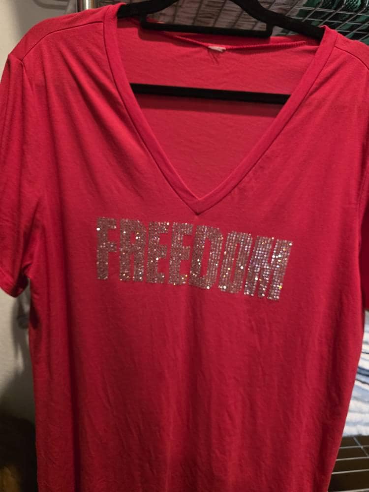 Show your patriotic pride with this freedom bling shirt featuring sparkling rhinestones and bold USA flag details. This personalized custom USA flag tee makes a fun customized gift idea for the Fourth of July or any patriotic celebration.